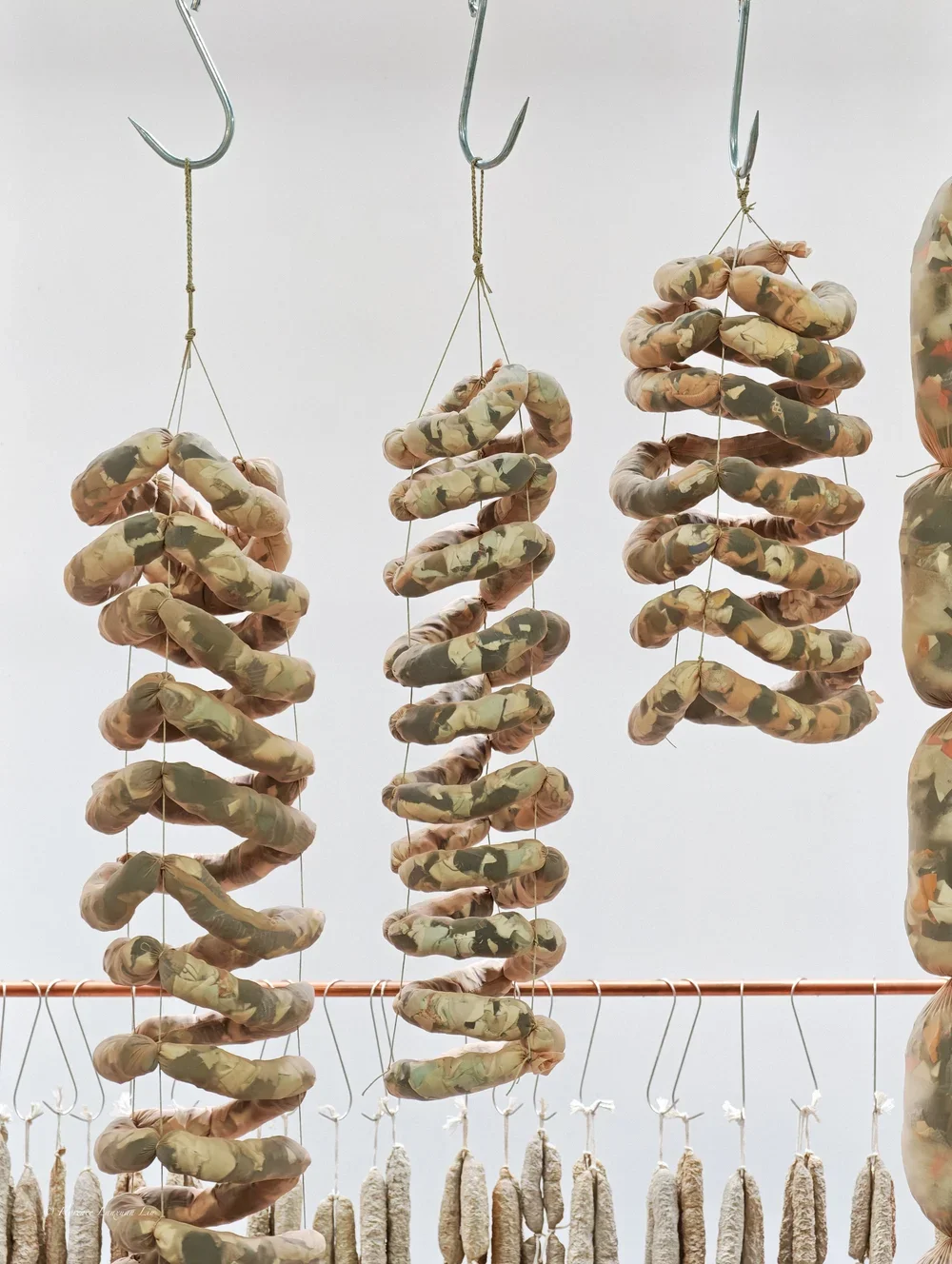 The resulting forms of hanging “sausages” suggest a state of contradictory coexistence: they are both an aggregation of personal histories into a regenerated whole and a disciplined body in which its uniform hanging implies constraint. This visual tension mirrors the forces that shape and dissolve the individual, tracing a metamorphosis from distinct identity into collective material.